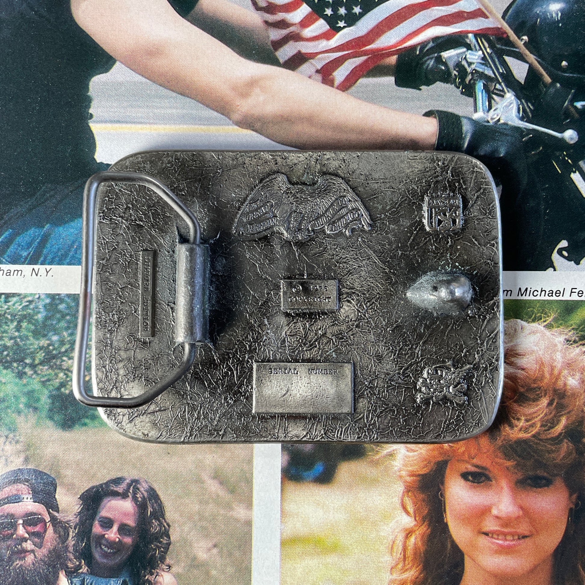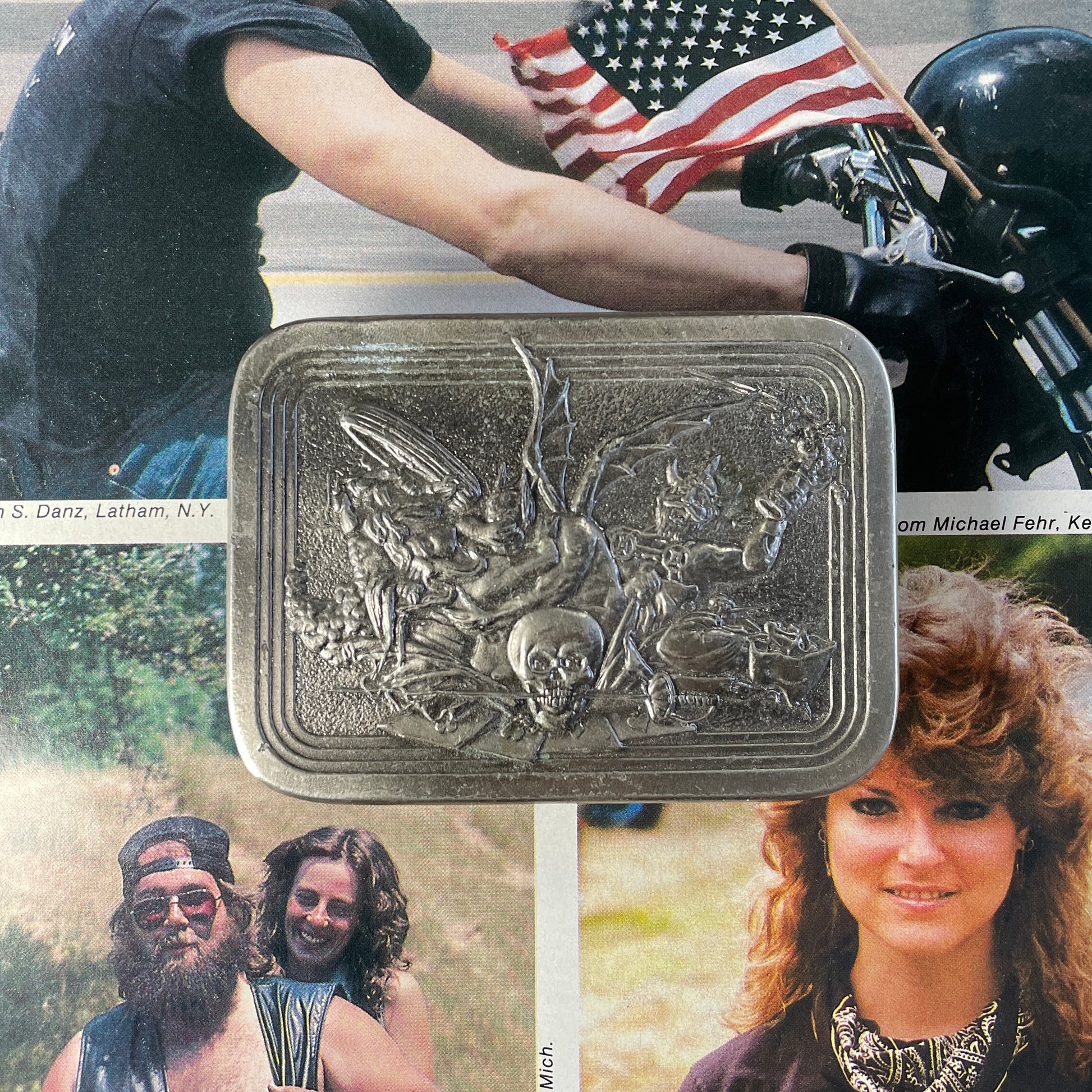 Vintage Buckle with all kinds of crazy stuff going on: a bike, a viking, a demon, skull, cards... what else do you need?